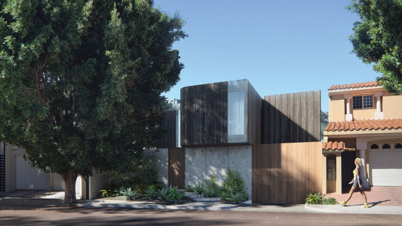 The project's front facade is a perfect example of how the house is divided by its two levels; the first level houses the public space while the second level houses the private. The public space is modest with traditionally angled walls made of simple materials; concrete, wood, and stucco. The private space, on the other hand, is more imposing with walls made of black oak wood − only fractured by the generous roof-to-ceiling windows − and even extending beyond the first floor's reach while gently laying atop it.