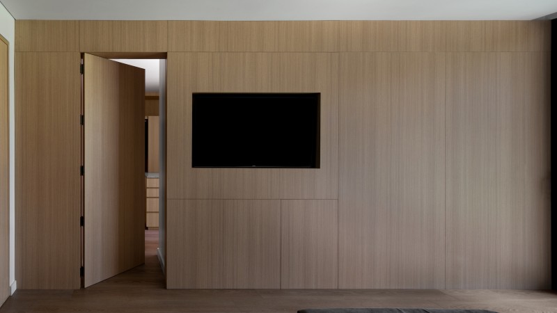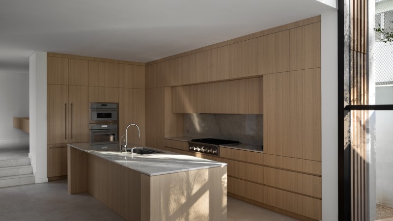 Crafted from Oak wood, the kitchen is integrated into the paneled walls, creating a sleek and uncluttered space.