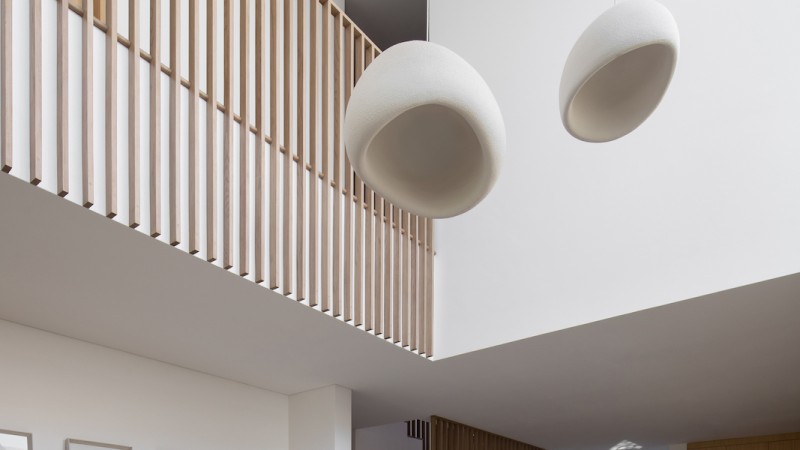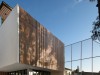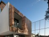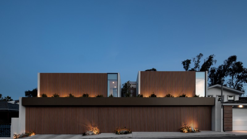 The project's facade is covered by a series of thin aluminum columns with a wooden finish, creating a screen which allows for light to penetrate the interior spaces while maintaining its privacy.