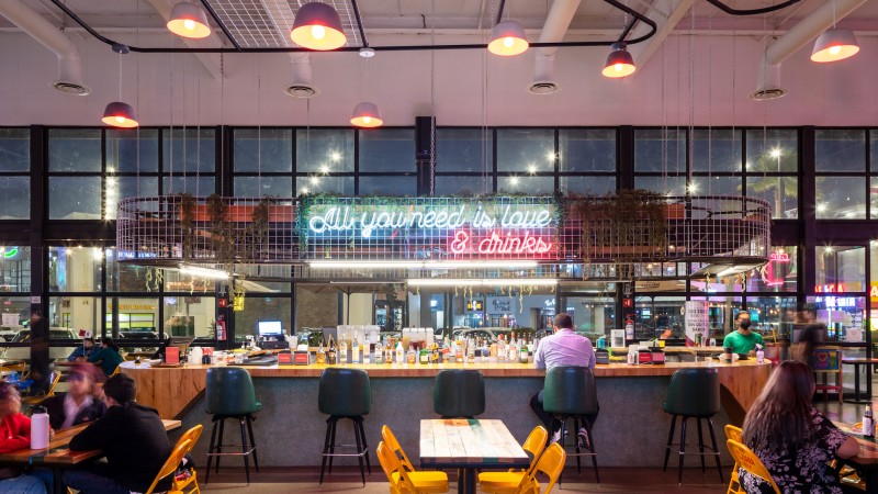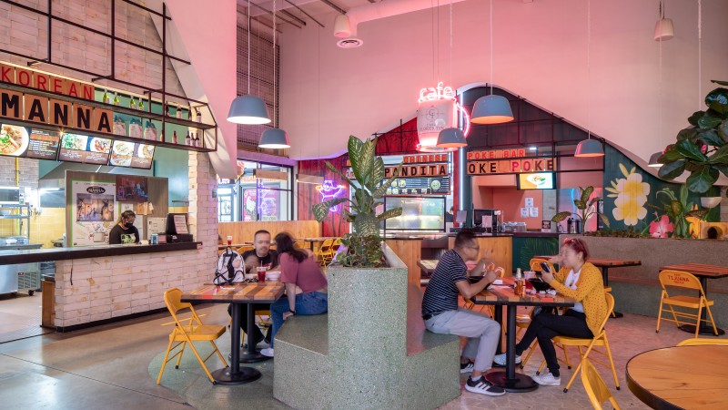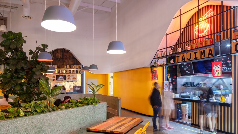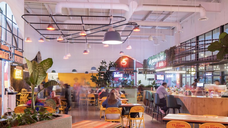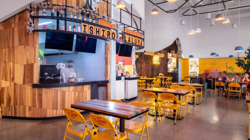 The project is comprised of 10 puestos ranging from hamburger joints to traditional Mexican kitchens to the popular San Diego based ramen chain, Tajima. The project also includes 3 smaller puestos, tailored for smaller businesses like pastry or coffee shops, and a cocktail bar near the project's entry.
