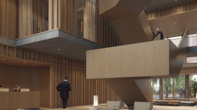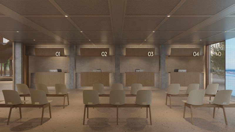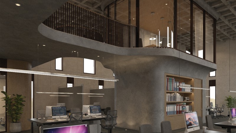 The first floor serves as the primary commercial space. Divided by the lobby, the sales branch cashiers and offices are placed on the right while the left houses an employee kitchen and dining area in the back and three 700 SF shop units in the front, each with its own entry. The second floor houses the area of operations which includes the accountant offices, the human resources office, the director's offices, etc. along with meeting rooms, a kitchenette, and balcony. The third floor houses the principal office, director's office, an additional work area, and the primary meeting room which oversees the area of operations. This floor also contains three balconies along with a private staircase and elevator for executive use only.